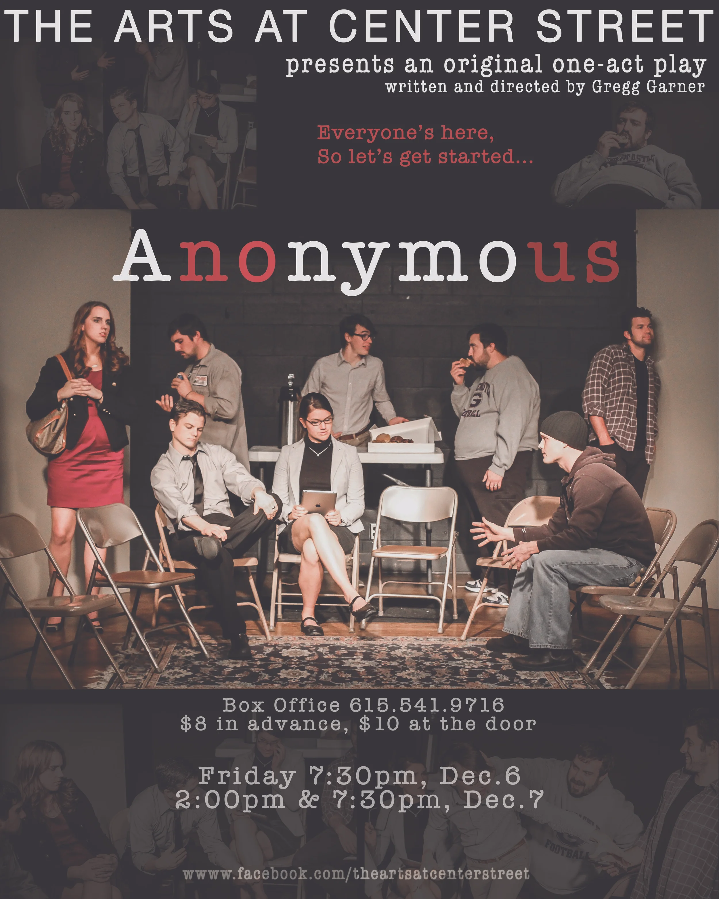 “Anonymous”, written and directed by Gregg Garner, is a drama with emotive dialogue that challenges viewers to explore new possibilities in our lives as adults, even with so-called baggage. In “Anonymous”, strangers in a support group reluctantly stumble into conversations about each character’s identity. Through the witness of such raw, potent material, the play illuminates questions of what defines people, what is or should be the human response to loss, and the potential to recover from mistakes.